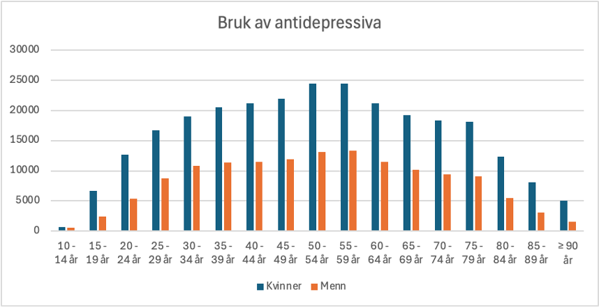 Men bruken av antidepressiva fortsetter også for den voksne kvinne. Selv om bruken går noe ned fra alder 60 år og utover, så holder den seg på høyt nivå, og hele tiden mye høyere enn for menn. Kvinner har faktisk gjennom livet et dobbelt så høyt forbruk som menn av slike medikamenter.