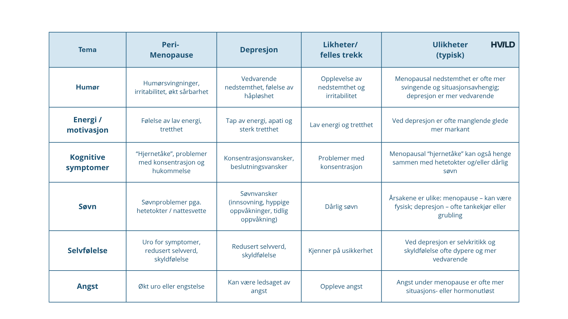 Tabellen nedenfor viser noen likheter og forskjeller mellom symptomer på en klinisk depresjon og symptomer på overgangsalder. Det er også viktig å nevne at for den kvinne som går med ubehandlede symptomer over tid, så kan det også gå over i en alvorlig depresjon.